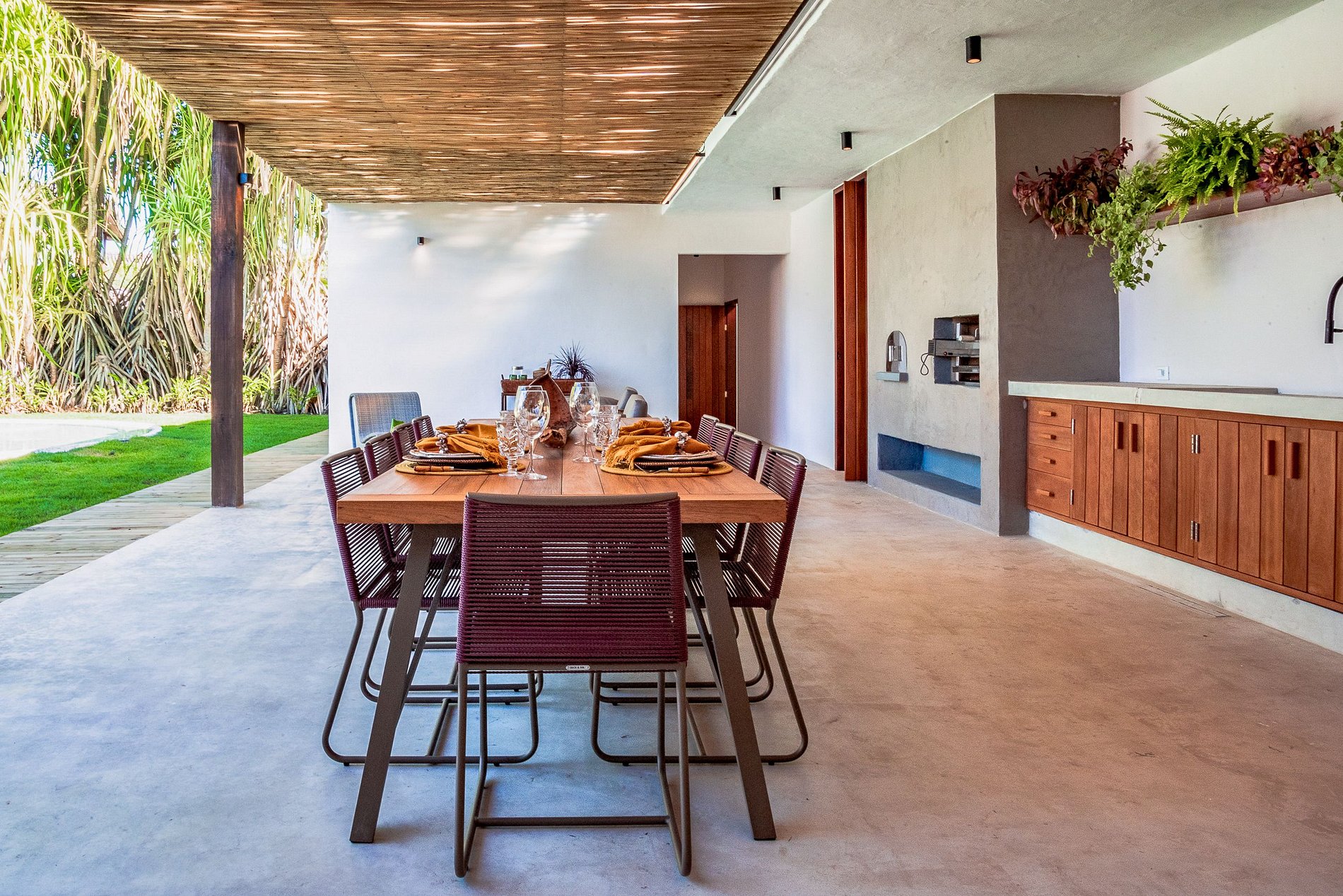 O pavilhão principal abriga um ambiente gourmet de primeira linha, uma confortável sala de estar, lavabo e uma área de estar íntimo. O gourmet dispõe de uma ampla variedade de equipamentos, como cooktop, geladeiras, forno, Nespresso e adega com duas zonas de temperatura. A mesa com capacidade para 12 pessoas e uma ilha com quatro banquetas tornam este espaço perfeito para refeições memoráveis. A louçaria surpreenderá os hóspedes em cada refeição, e uma seleção generosa de copos de cristal e acrílico atenderá às mais diversas preferências de bebidas, desde cerveja e gim até vinho e champanhe.
