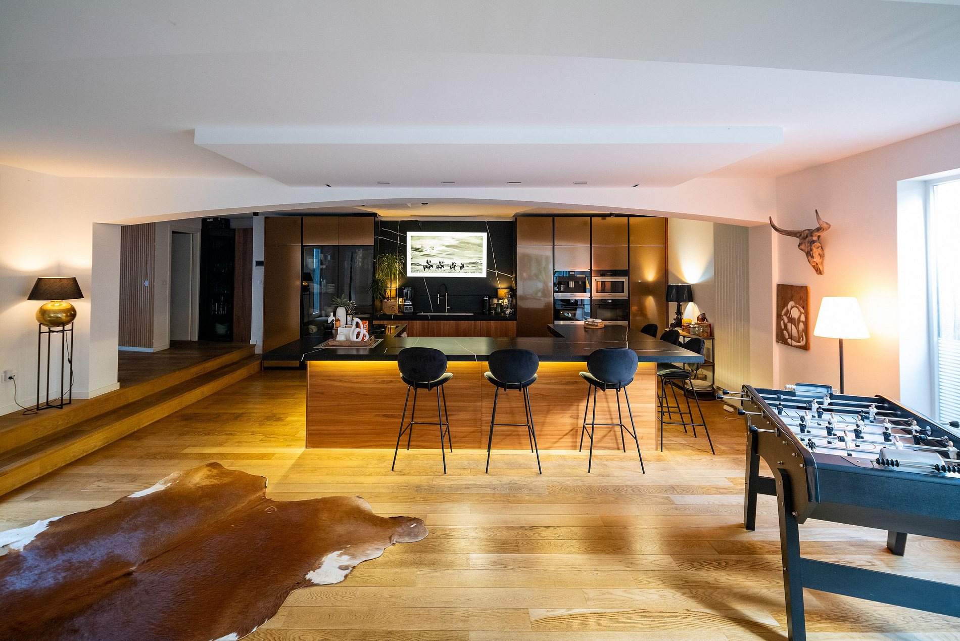 No interior, você será recebido por uma ampla sala de estar de plano aberto que se abre para um jardim exuberante equipado com uma cozinha de verão, além de uma piscina aquecida que convida à relaxar. Todo o ambiente cria um oásis de tranquilidade e entretenimento.