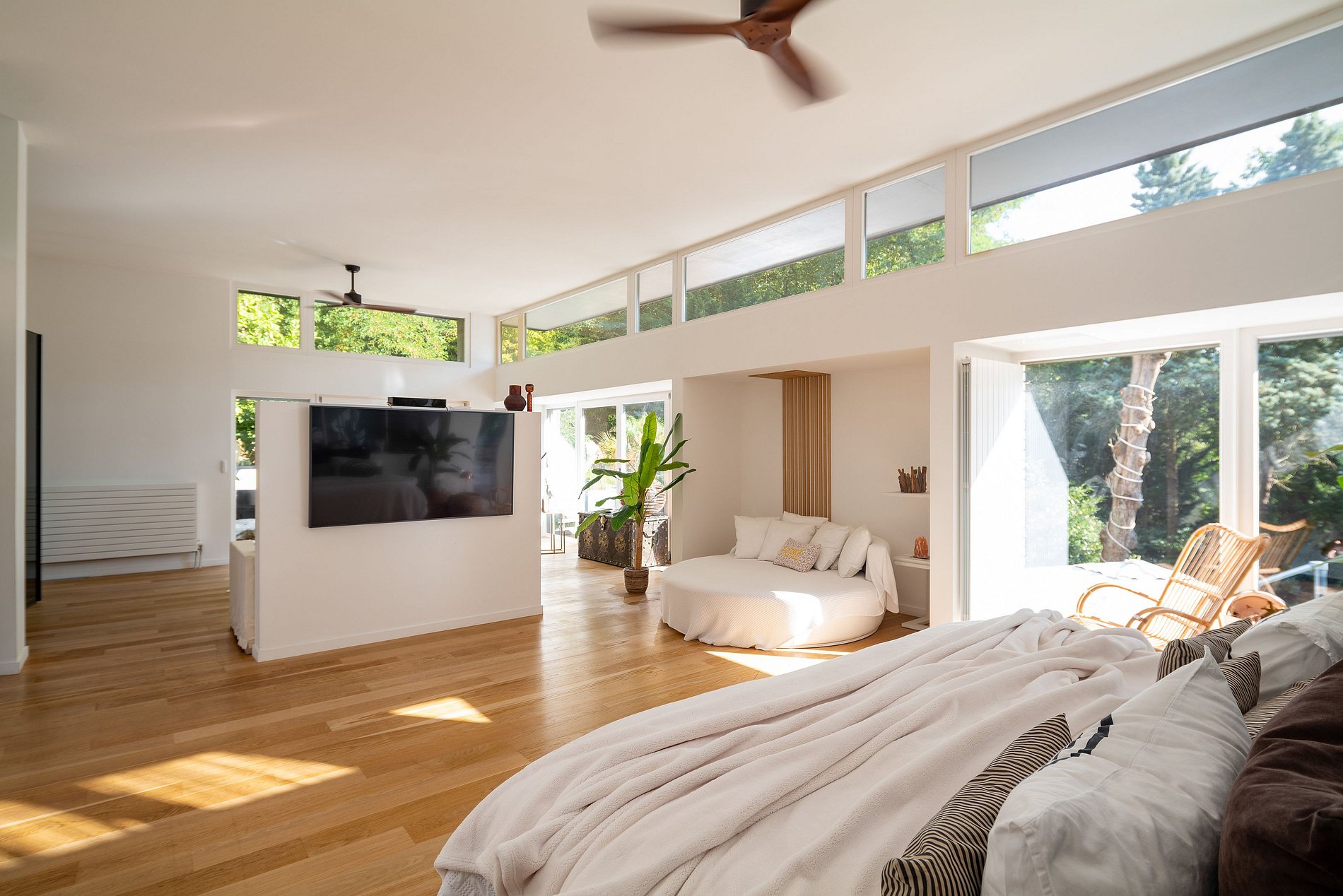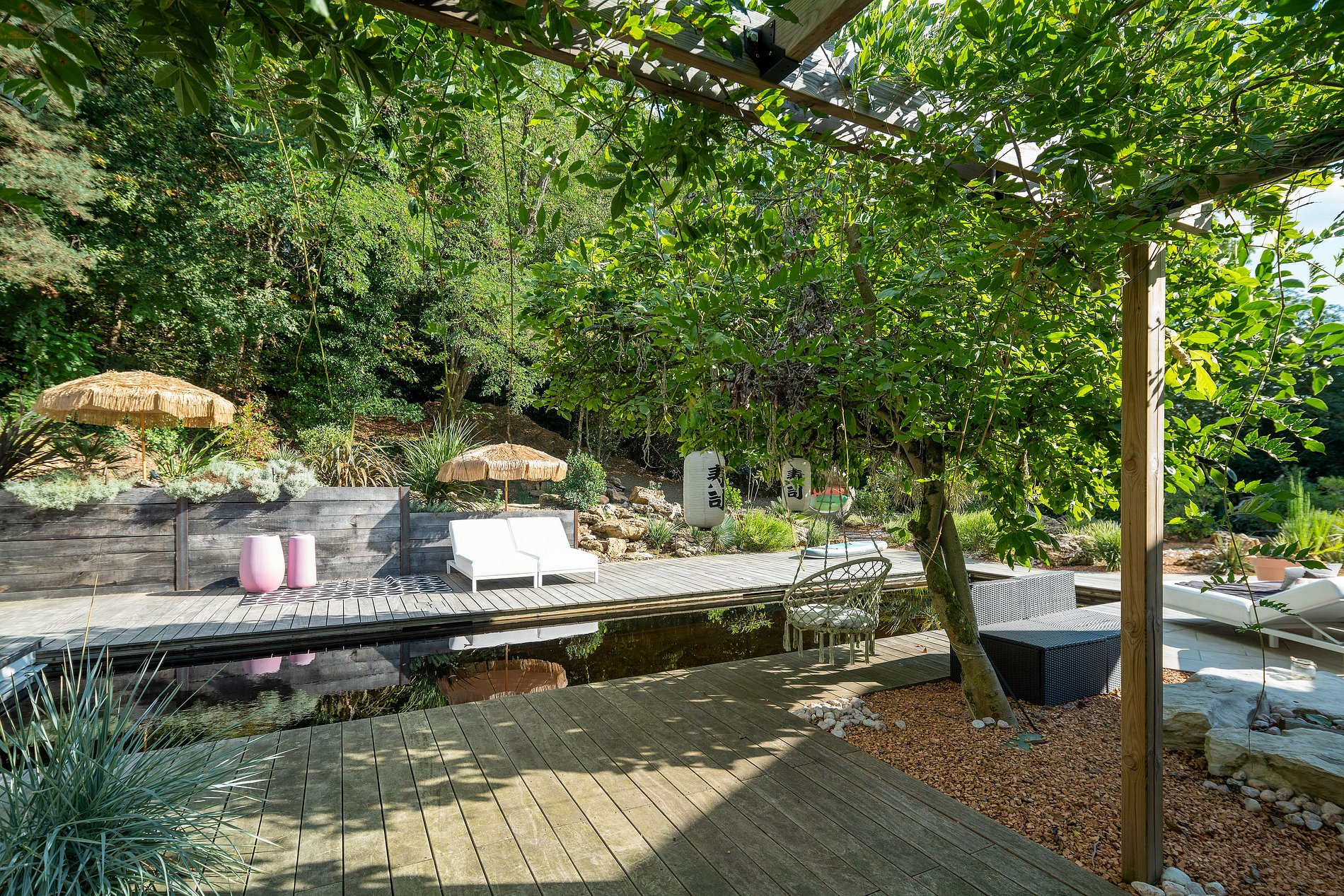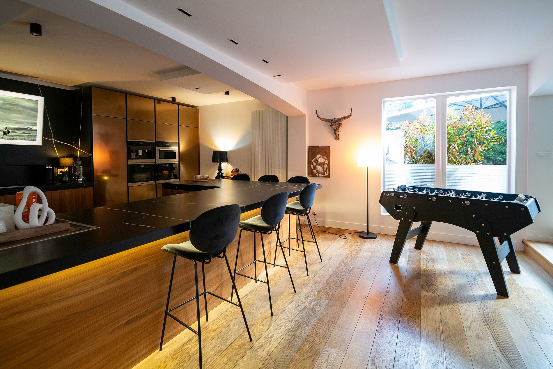 No interior, você será recebido por uma ampla sala de estar de plano aberto que se abre para um jardim exuberante equipado com uma cozinha de verão, além de uma piscina aquecida que convida à relaxar. Todo o ambiente cria um oásis de tranquilidade e entretenimento.