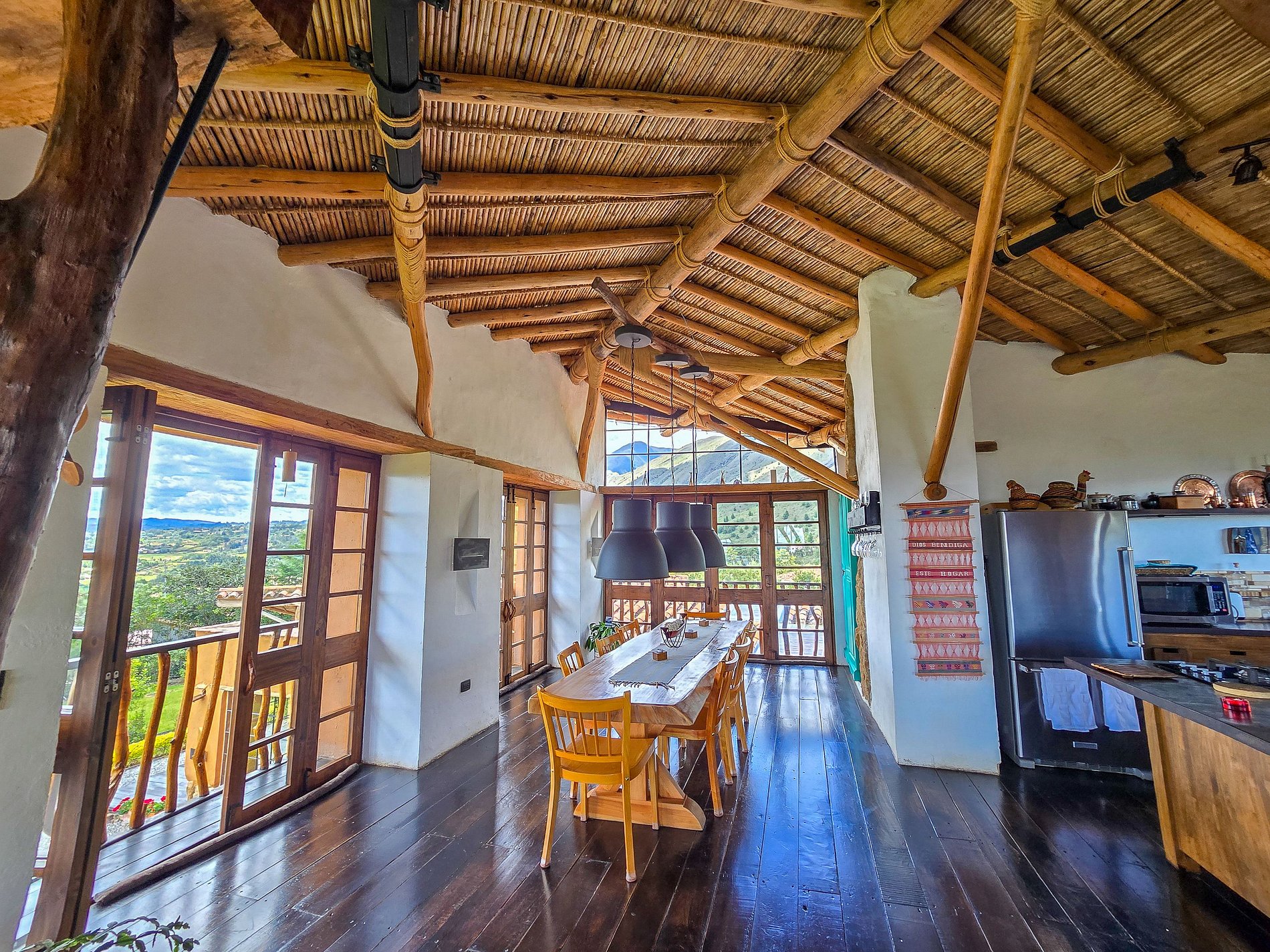Esta casa singular está situada a poucos minutos do centro histórico de Villa de Leyva e oferece uma vista ampla das montanhas e vales ao redor. Construída em taipa e finalizada com pedra talhada, madeira e tetos tradicionais de cana, a arquitetura se integra de forma orgânica à paisagem, oferecendo privacidade, conforto e um estilo acolhedor.