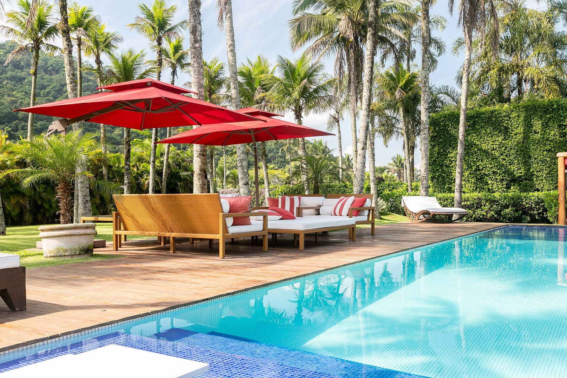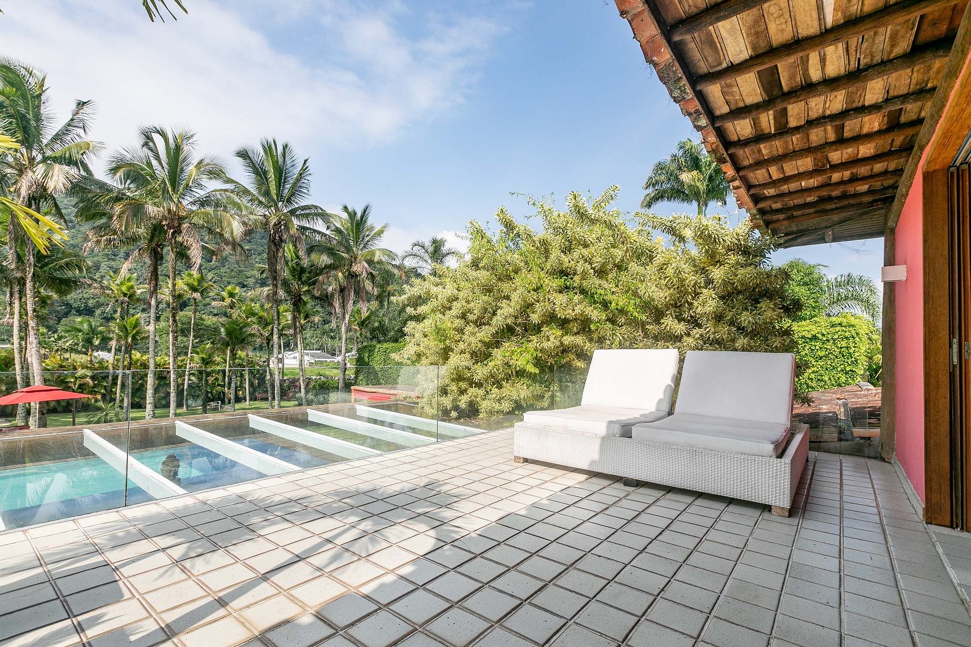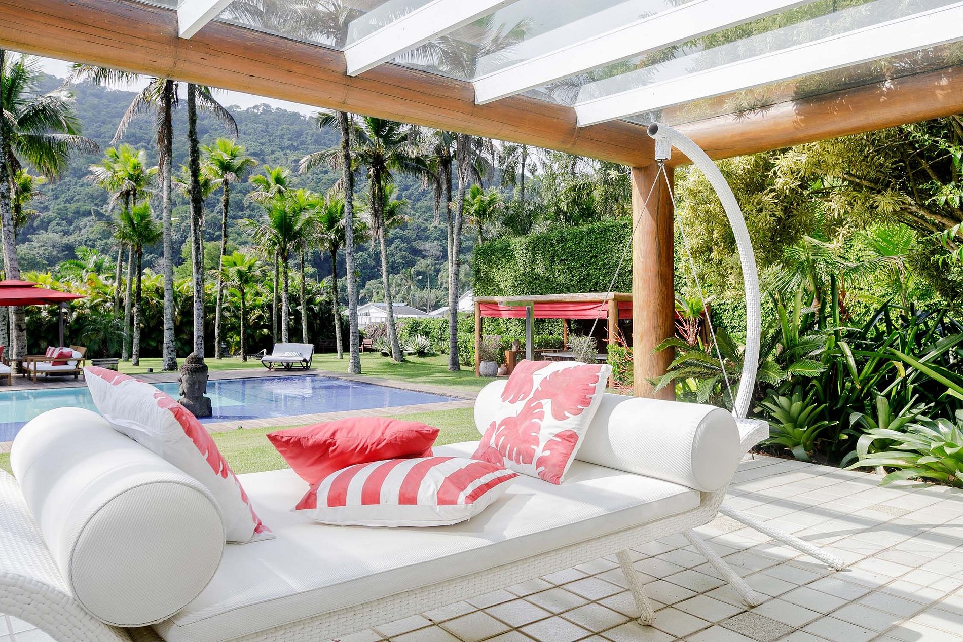 1 suíte Master com sofá, TV, cama king-size, banheiro, walk-in closet e varanda com vista para a área da piscina
