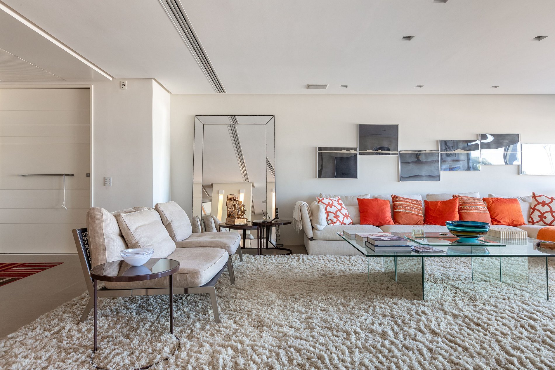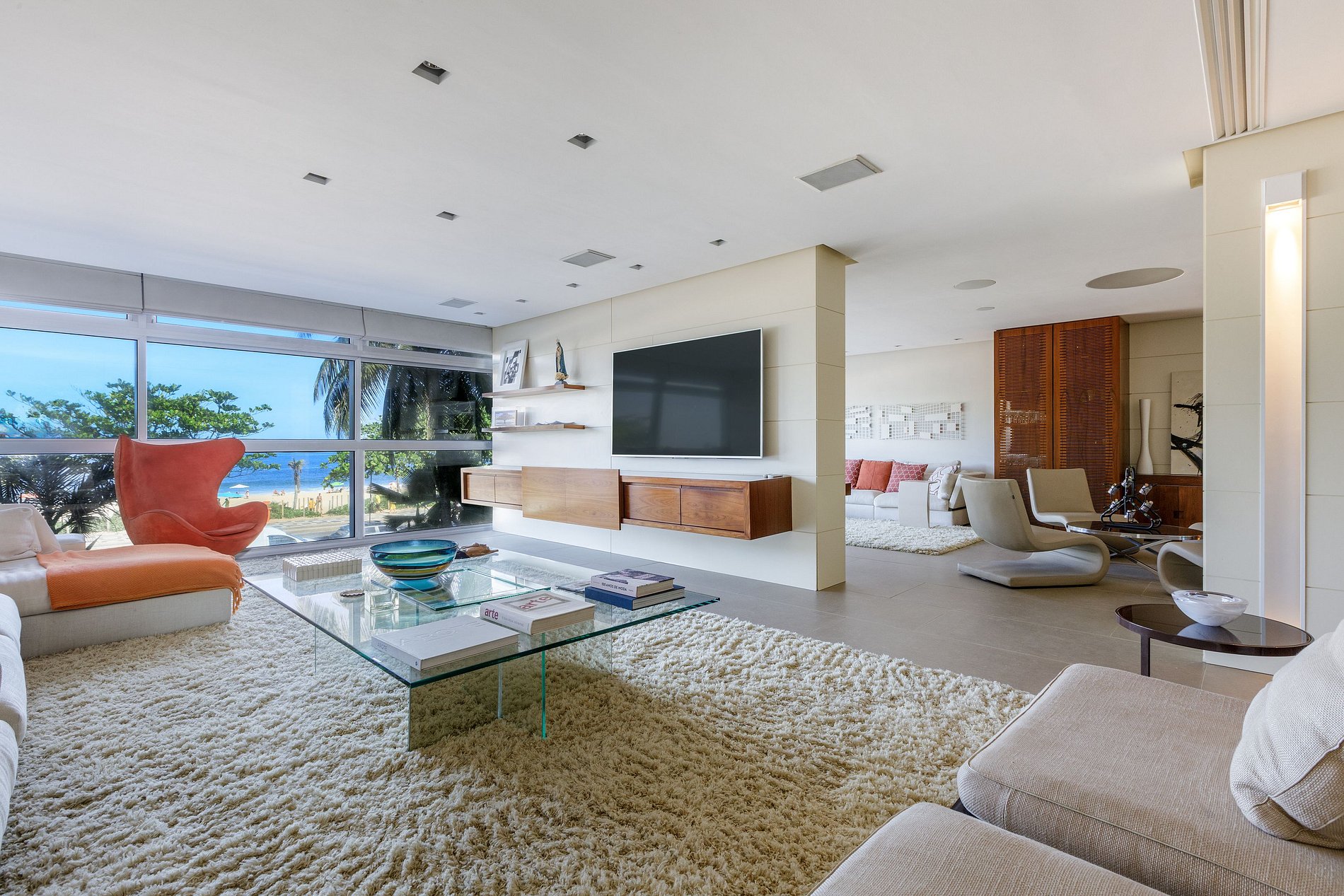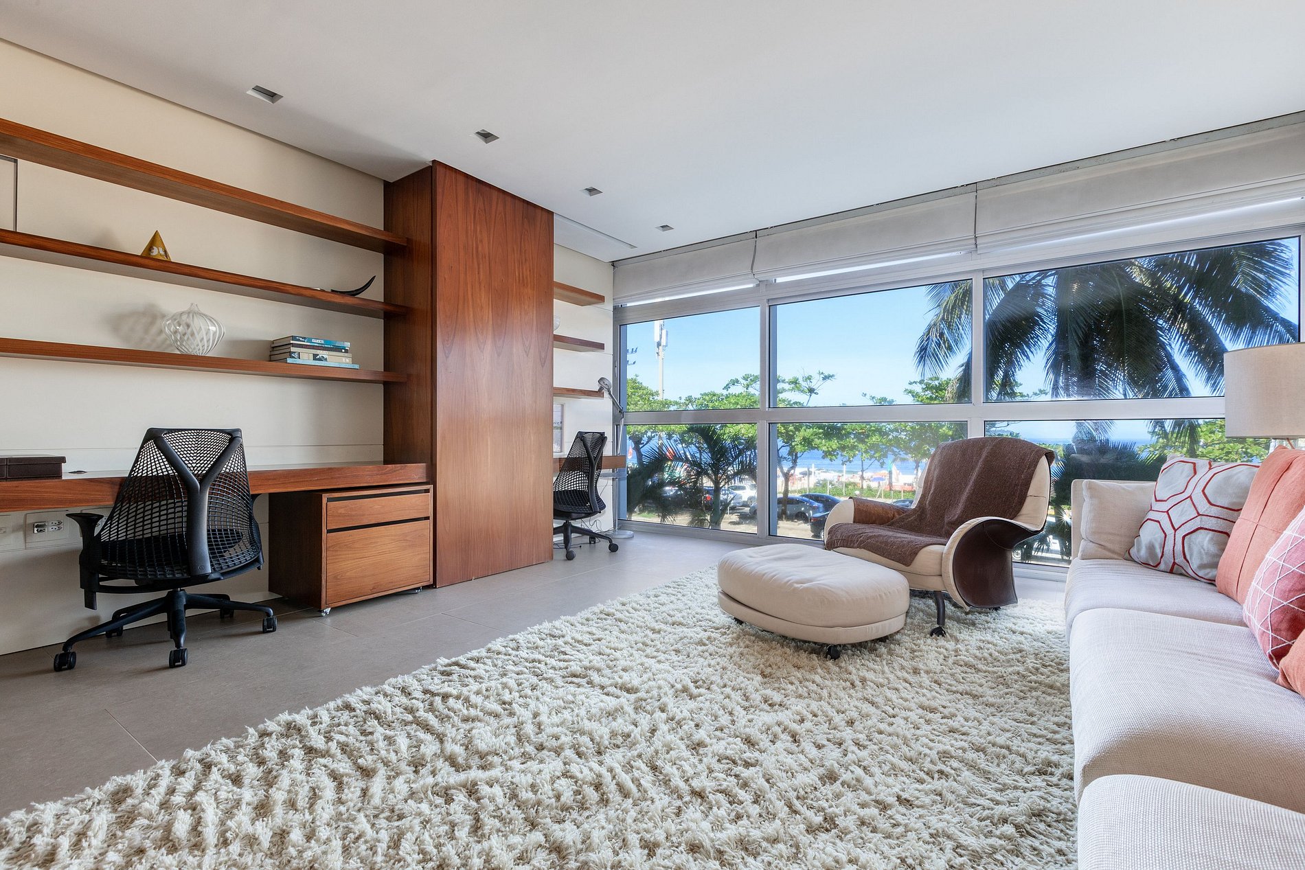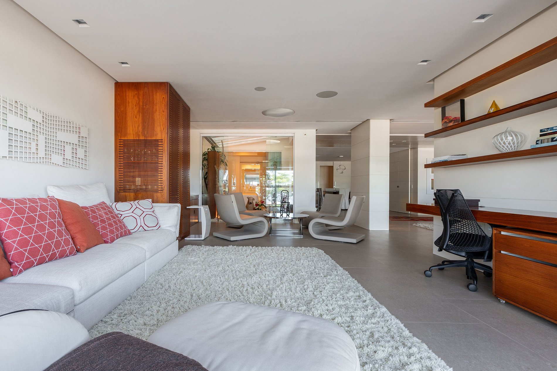A sala de estar, ampla e contemporânea, é dividida em dois ambientes integrados, incluindo um espaço que pode ser adaptado como escritório. A conexão fluida com a sala de jantar valoriza a luminosidade natural e realça a vista para o mar. No centro do layout, um charmoso jardim de inverno decorado acrescenta um toque de aconchego e exclusividade ao espaço.
