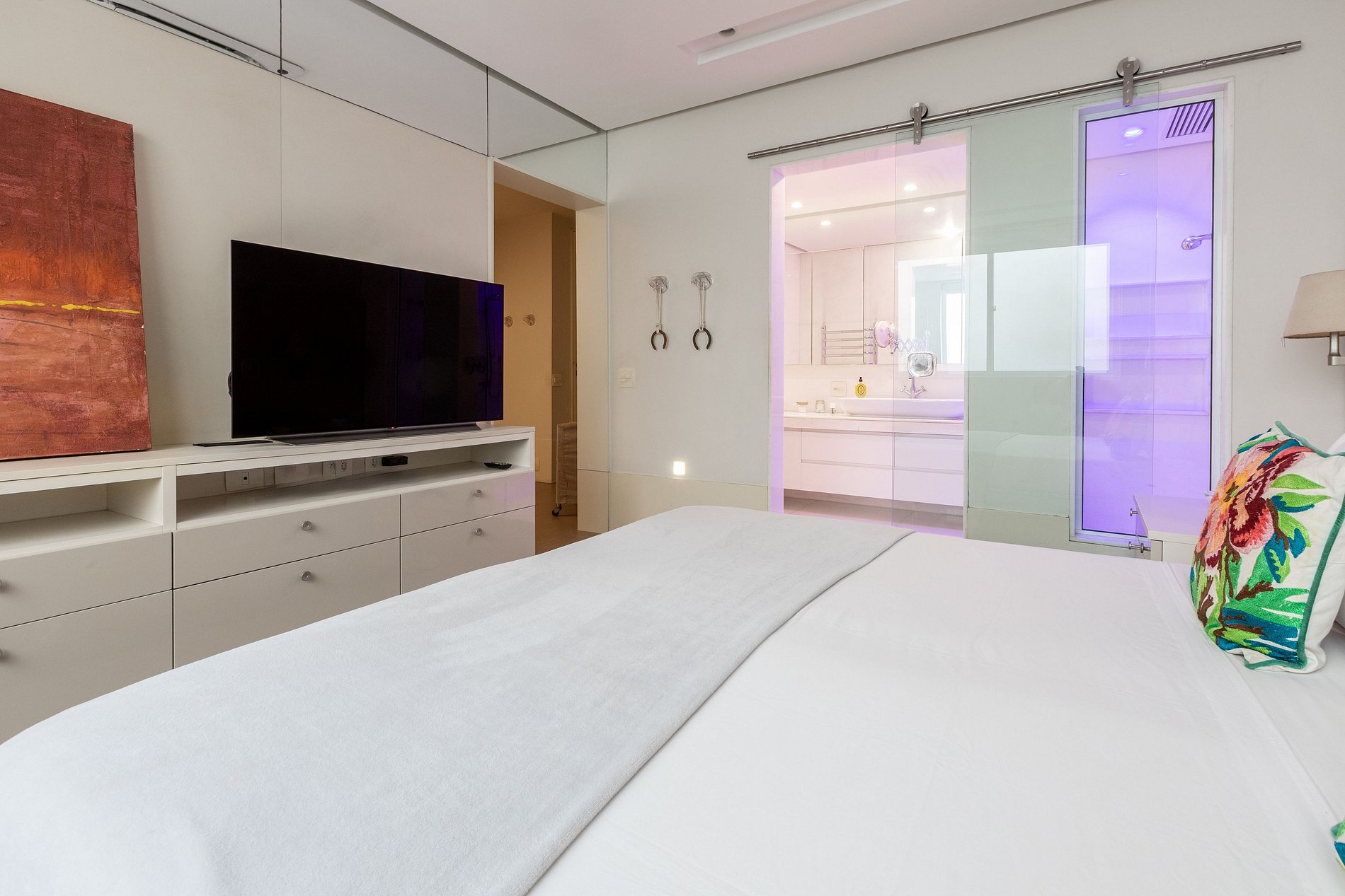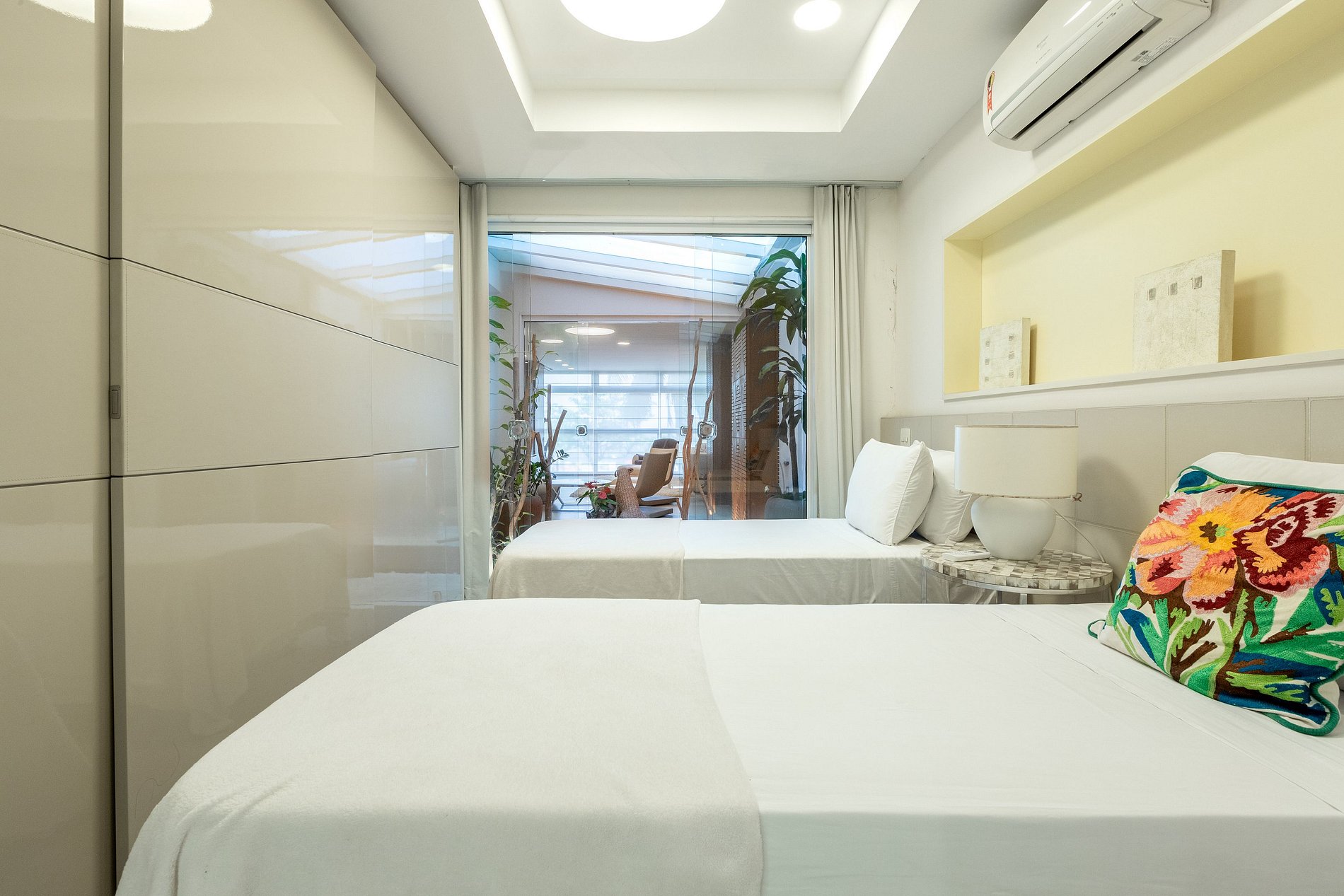 A área íntima conta com dois quartos. A suíte master é equipada com uma cama de casal e walk-in closet. O segundo quarto, com duas camas de solteiro