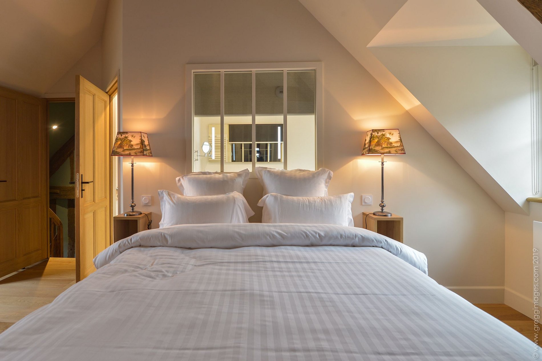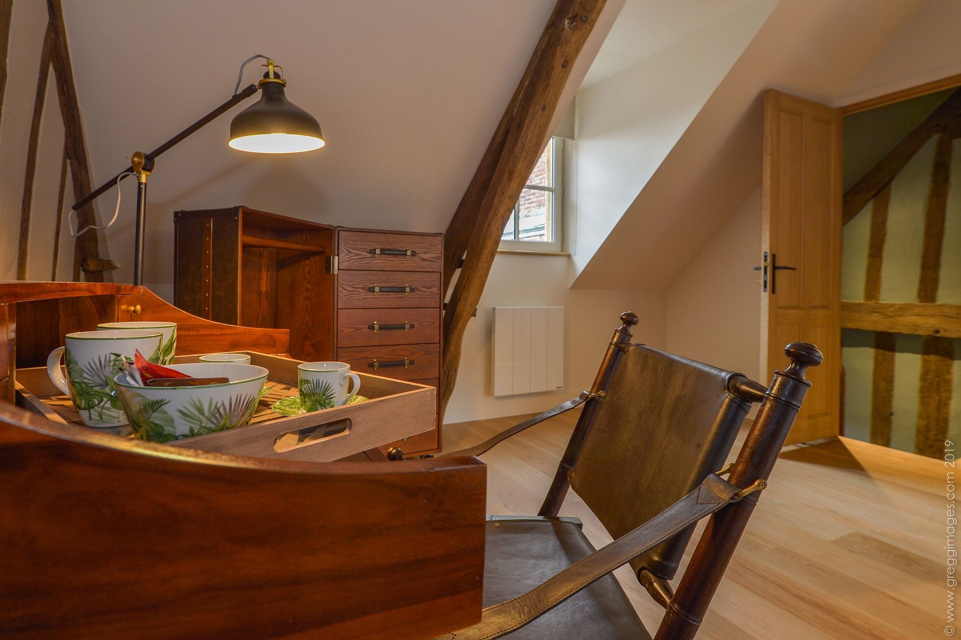 O segundo andar possui suíte sob o telhado com cama de casal, área de escritório e vista para o histórico Honfleur.