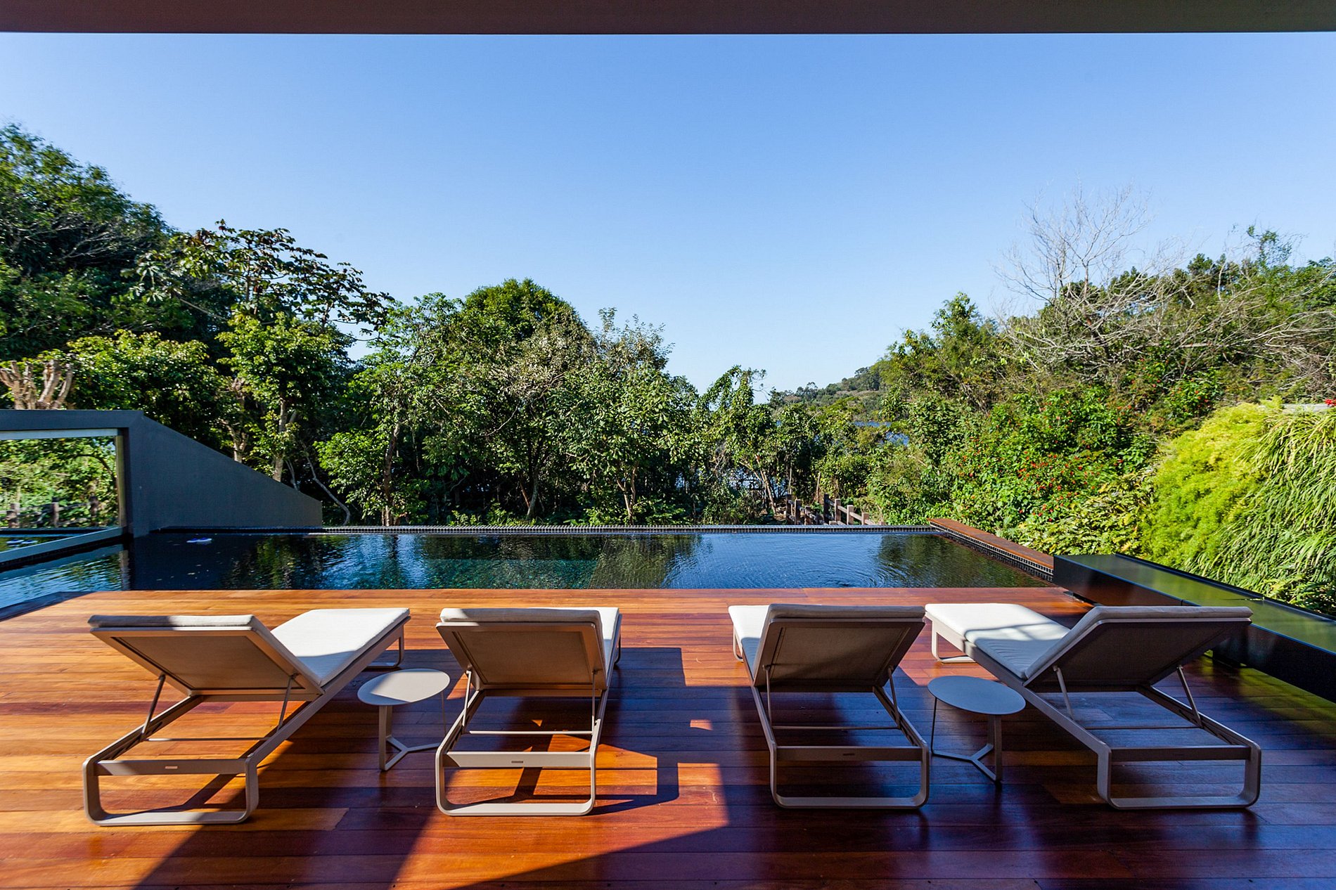 A primeira área a se destacar da casa é sua área externa com sua grande piscina em forma de L e está de frente para belas árvores e a lagoa, ao longo do deck, há quatro confortáveis espreguiçadeiras para banhos de sol ou simplesmente para descansar sob a luz da lua e das refrescantes brisas da noite.