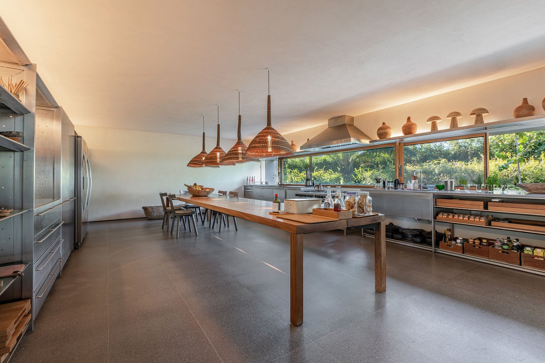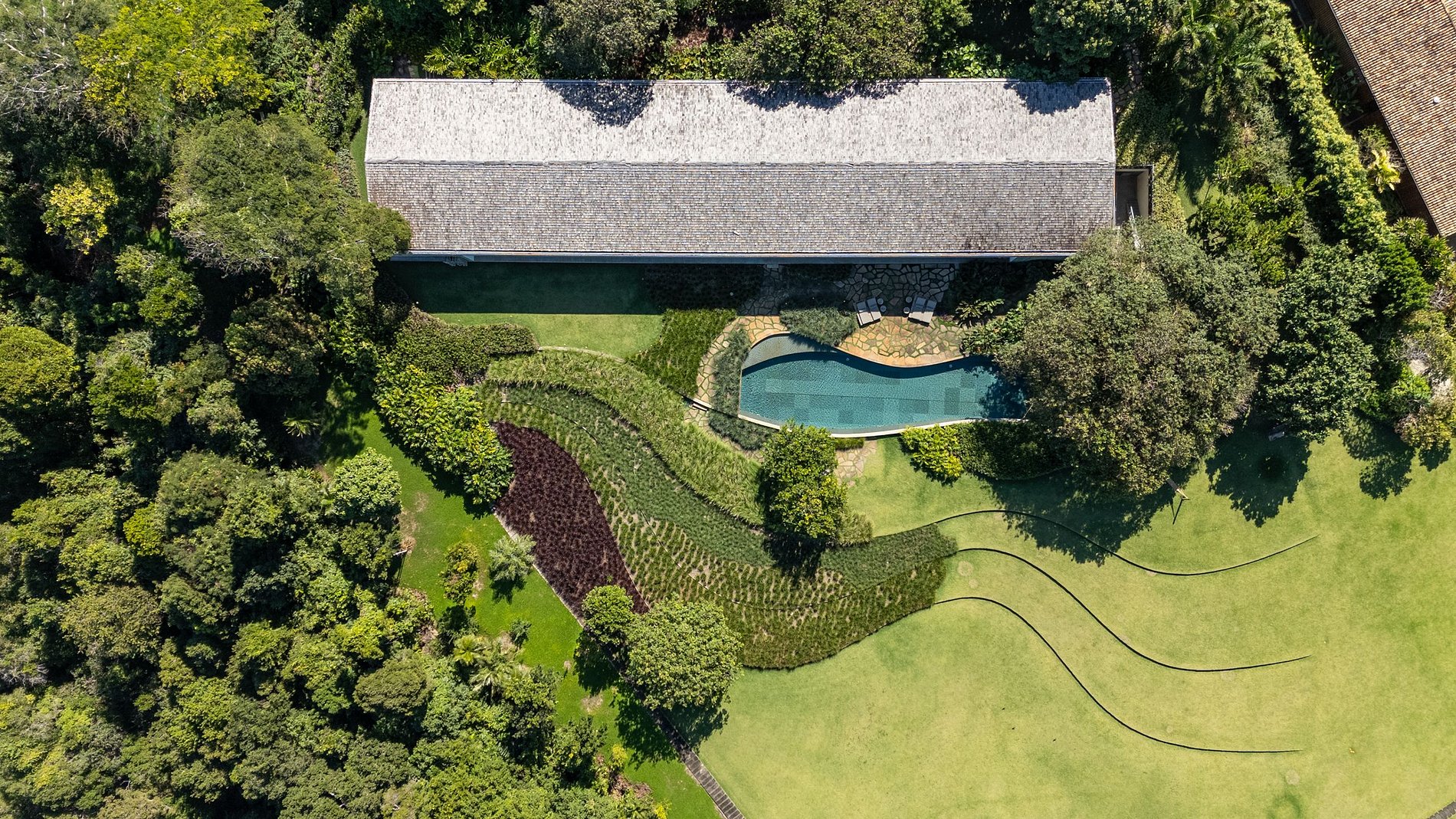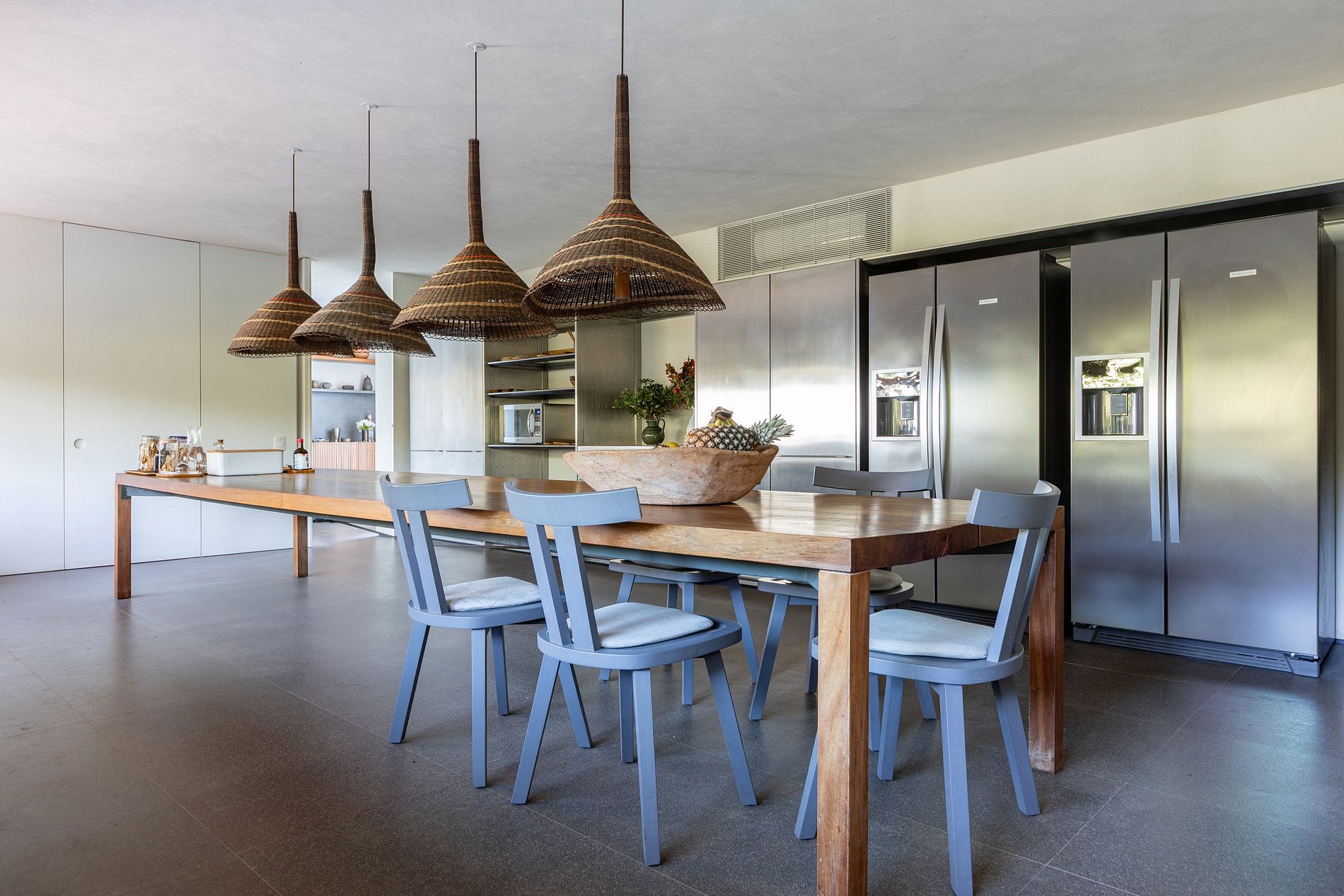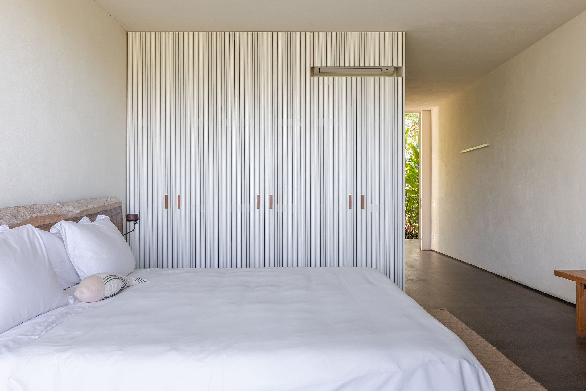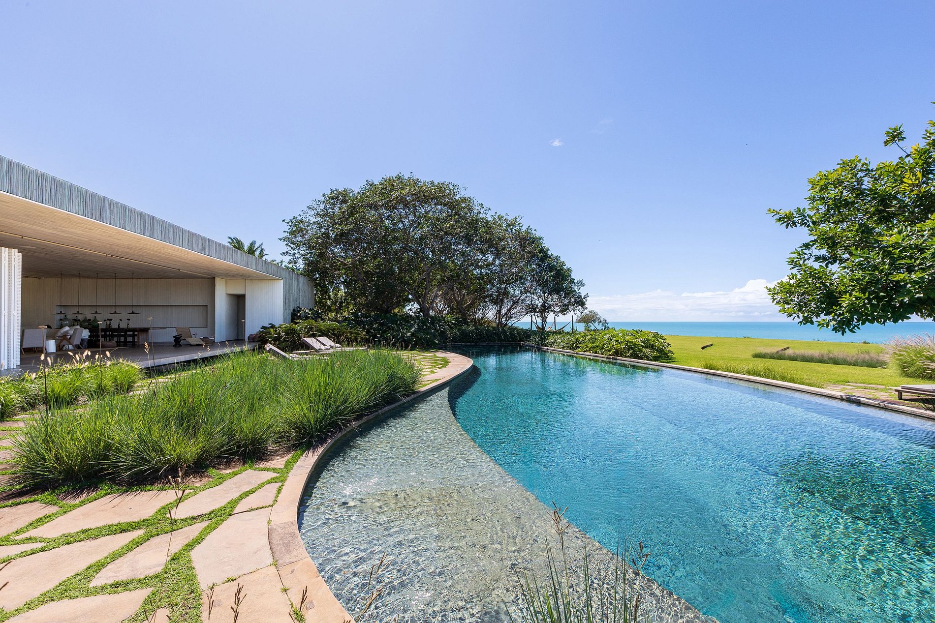 Ao atravessar a entrada, o visitante é recebido por um impressionante living de mais de 170 m², onde áreas de estar e jantar se expandem em continuidade com o exterior. O mobiliário, selecionado em antiquários paulistanos e reestofado em tons neutros e naturais, evoca sofisticação atemporal, em contraste poético com o cenário tropical. Portas e painéis móveis em Viroc se recolhem discretamente, dissolvendo os limites entre dentro e fora, criando uma experiência sensorial marcada por transparências, luz e sombra em constante transformação.