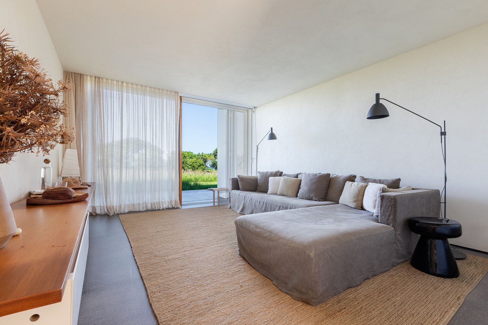 A residência dispõe de quatro suítes elegantes, todas concebidas para capturar a luz natural e enquadrar a vista para o mar. As amplas portas de correr abrem-se para jardins privados e para o horizonte azul, prolongando a vivência interna em uma continuidade fluida com a paisagem. Ao lado da sala principal, um jardim tropical meticulosamente desenhado cria uma coreografia de sombras e reflexos que se projetam no interior da casa, transformando cada instante em um espetáculo visual.