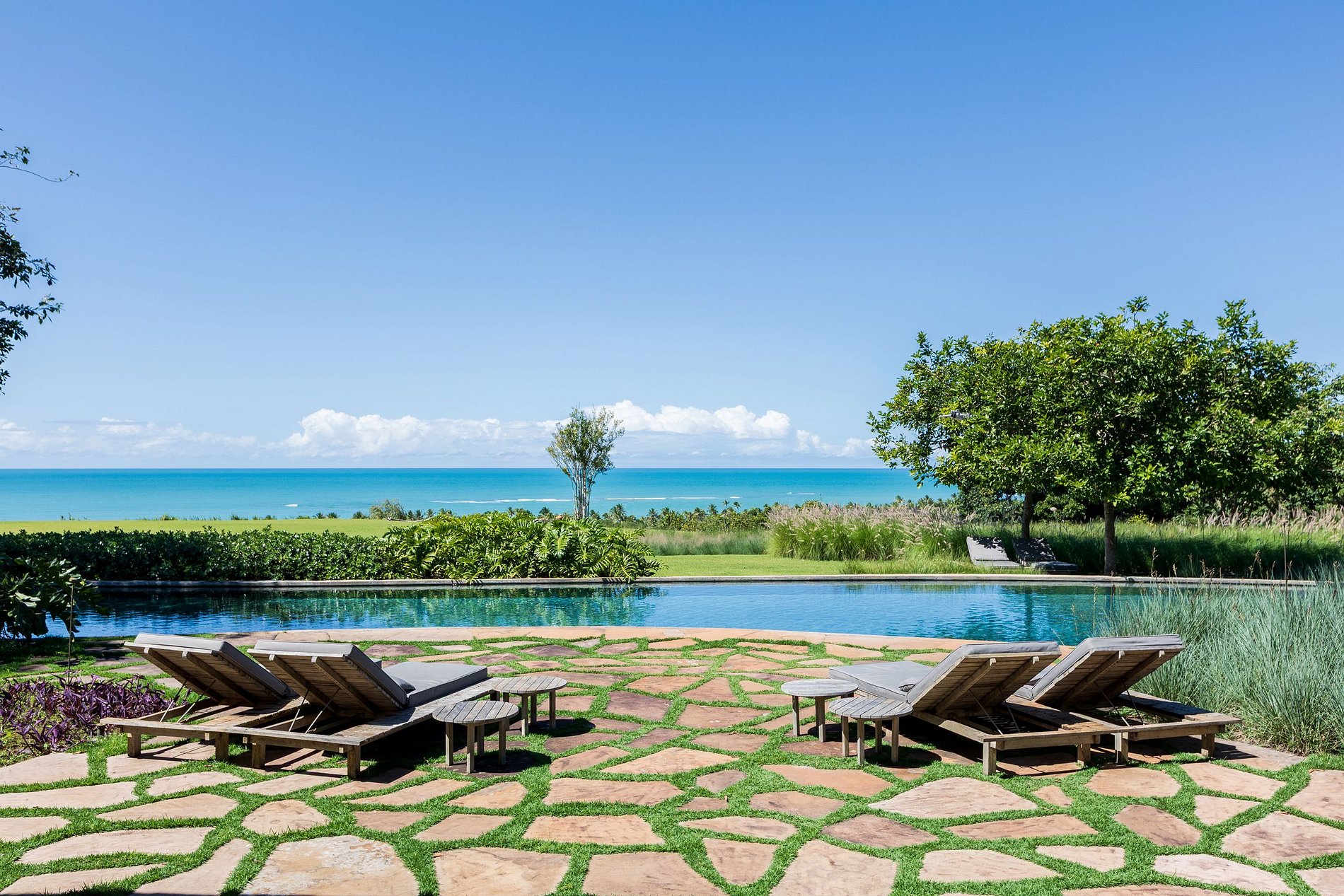 A residência dispõe de quatro suítes elegantes, todas concebidas para capturar a luz natural e enquadrar a vista para o mar. As amplas portas de correr abrem-se para jardins privados e para o horizonte azul, prolongando a vivência interna em uma continuidade fluida com a paisagem. Ao lado da sala principal, um jardim tropical meticulosamente desenhado cria uma coreografia de sombras e reflexos que se projetam no interior da casa, transformando cada instante em um espetáculo visual.