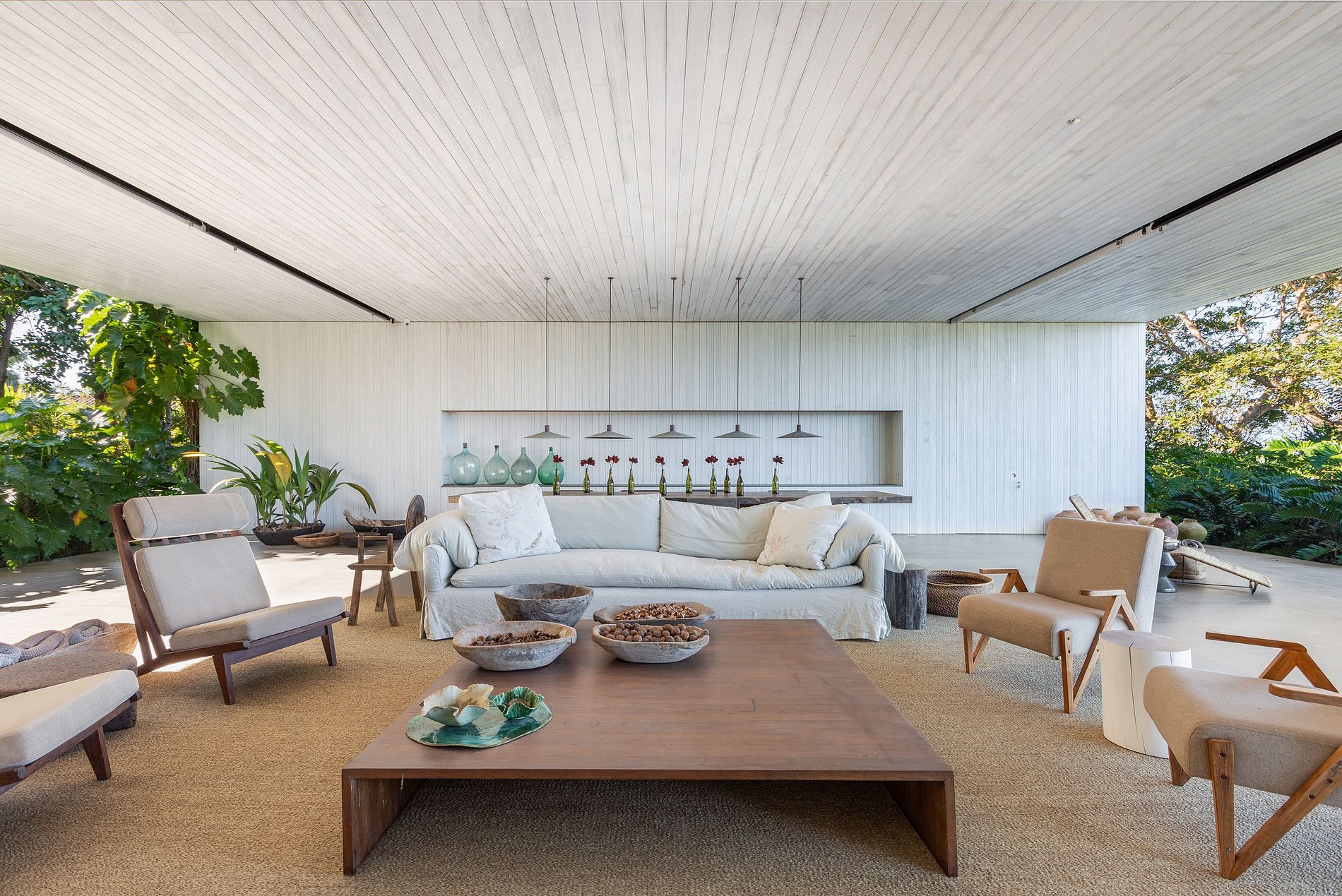 Ao atravessar a entrada, o visitante é recebido por um impressionante living de mais de 170 m², onde áreas de estar e jantar se expandem em continuidade com o exterior. O mobiliário, selecionado em antiquários paulistanos e reestofado em tons neutros e naturais, evoca sofisticação atemporal, em contraste poético com o cenário tropical. Portas e painéis móveis em Viroc se recolhem discretamente, dissolvendo os limites entre dentro e fora, criando uma experiência sensorial marcada por transparências, luz e sombra em constante transformação.